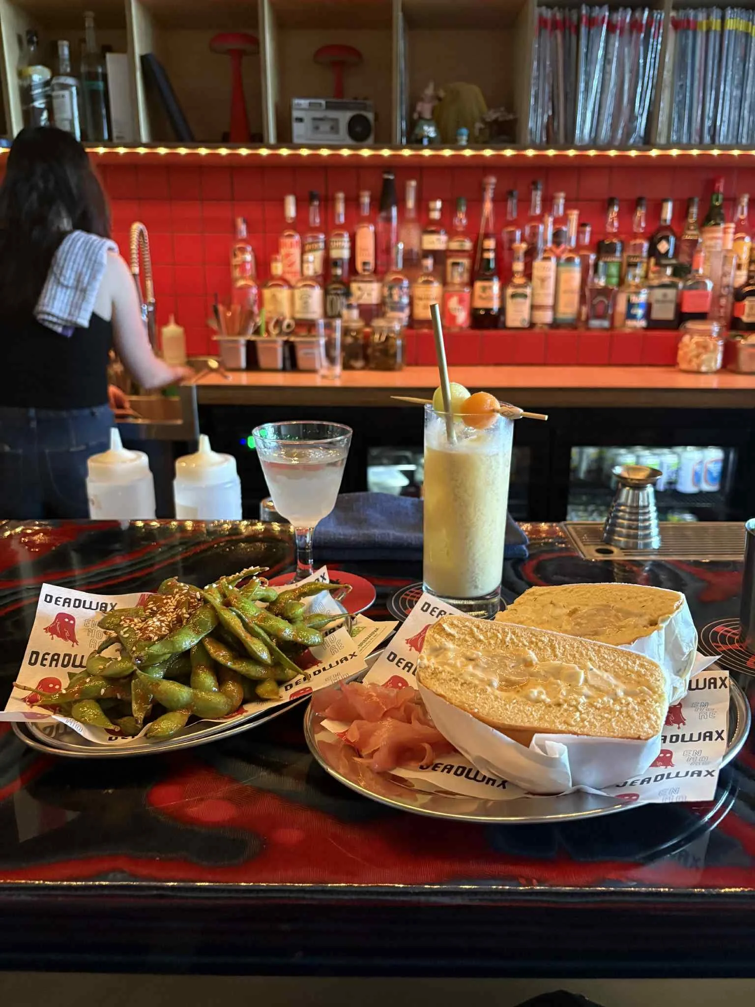 Passing by the melting ghost on the glass front doors and the pumping tunes from the front turntables hits you like a mosh pit. Intimately spaced tables and chairs run along a half-booth wall across from the tall bar – made from more than 70 layers of black and red denim set in resin. There’s even enough room to get up and dance should the cocktails flow late into the night (Deadwax stays open until 2am on Fridays and Saturdays).